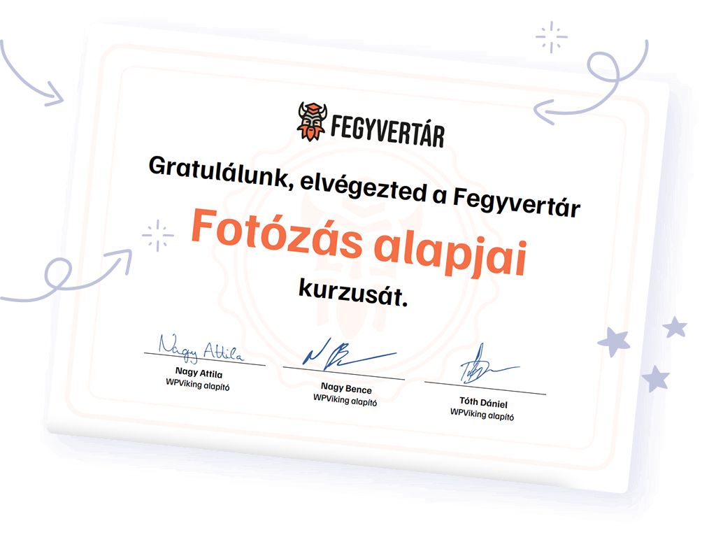 A tanfolyam végén nemcsak lezárjuk az együtt töltött tanulási utat, hanem meg is ünnepeljük a fejlődésedet. A záró kvíz segít átlátni, mennyit léptél előre, és mennyire vált a fotózás tudatos, magabiztos része az életednek. A sikeres teljesítés után “képernyőhöz” kapod az okleveled: ez nem egy egyszerű papírt, hanem egy kézzelfogható elismerést, ami bizonyítja, hogy a gombnyomkodásból valódi képalkotói látásmódra váltottál. Ez az oklevél emlékeztetni fog arra, hogy képes vagy bármilyen fotós célt megvalósítani, és inspirál majd, hogy tovább feszegesd a kreativitásod határait.