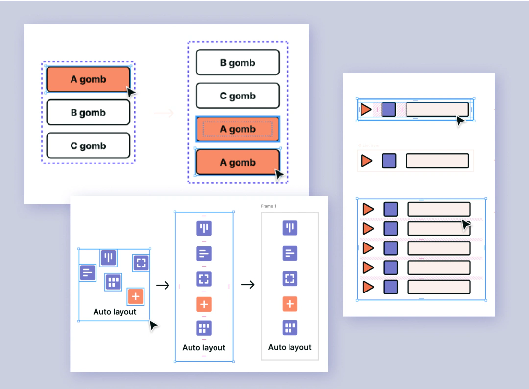 Ezután jönnek az alapműveletek: mozgatás, másolás, igazítás, elosztás, rendezés. Gyakoroljuk a stílusbeállításokat (színek, betűtípusok, effektek), és belemegyünk a Components alapjaiba. Megtanulod a Constraints (korlátok) logikáját is, majd jön az egyik legfontosabb téma: az Auto Layout.